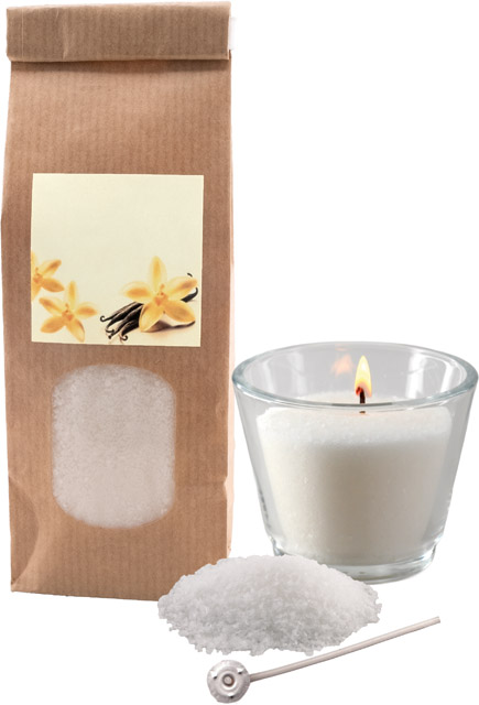Der angenehme Duft von Vanille schafft eine behagliche Stimmung in der kalten Jahreszeit. Das Wachsgranulat einfach in ein hitzebeständiges Gefäß füllen, den mitgelieferten Docht mittig platzieren und anzünden. Eine Werbeanbringung auf dem Standardmotiv des Etiketts oder eine individuelle Gestaltung ist ab 250 Stück möglich.