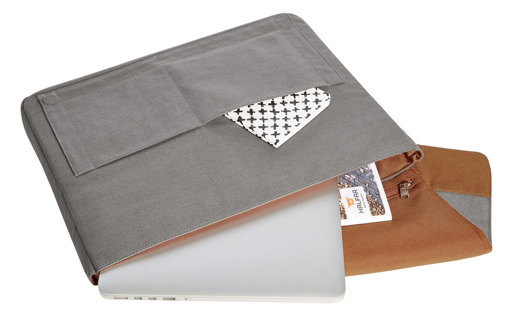 moderne, aufwändig verarbeitete Notebook-Hülle; liebevoll gestaltet mit beschichtetem Baumwoll-Besatz; geeignet für Notebook und DIN A4-Unterlagen; zwei flache Einsteckfächer auf der Front; Reißverschluss-Fach im Überschlag innen; großes Reißverschluss-Fach rückseitig; Magnet-Verschluss